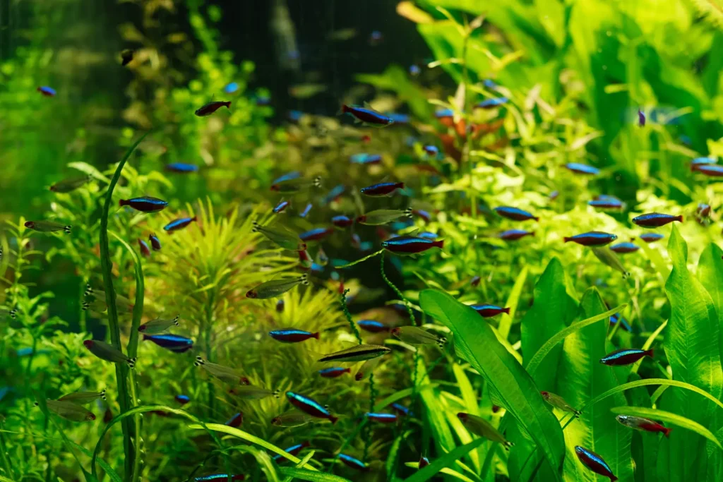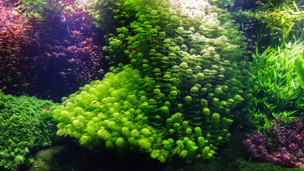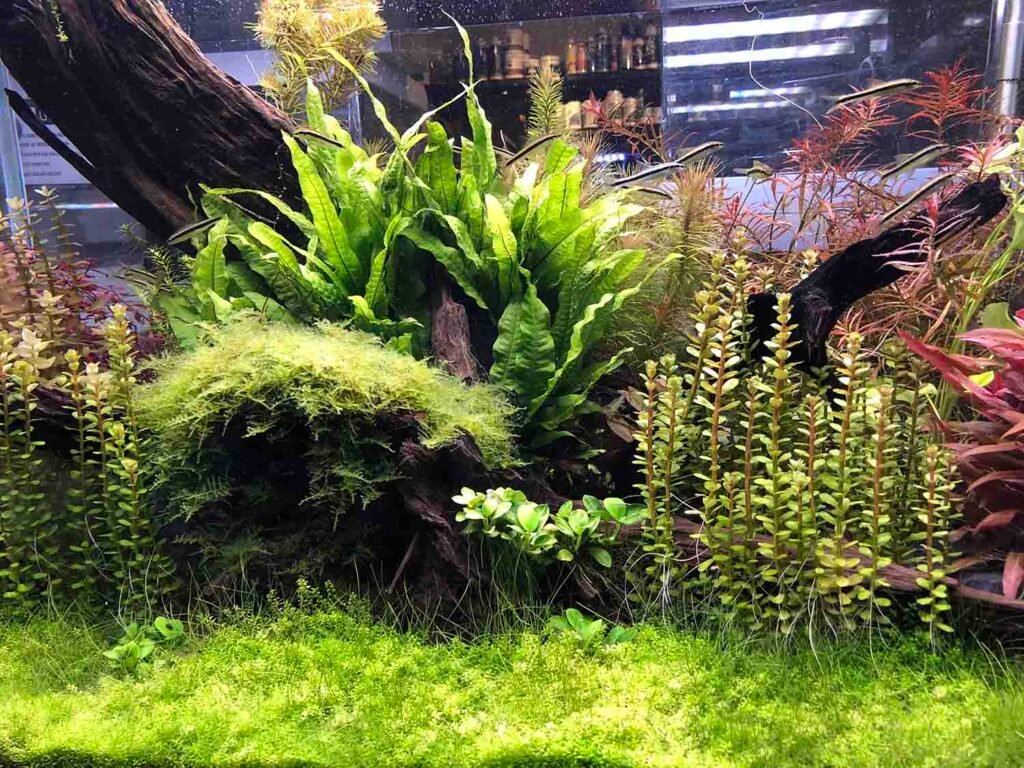 A lush, self-sustaining underwater garden. Our high-tech setups use CO2 injection and specialized nutrient substrates to grow vibrant aquatic flora.